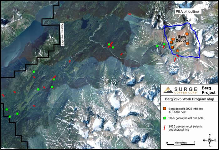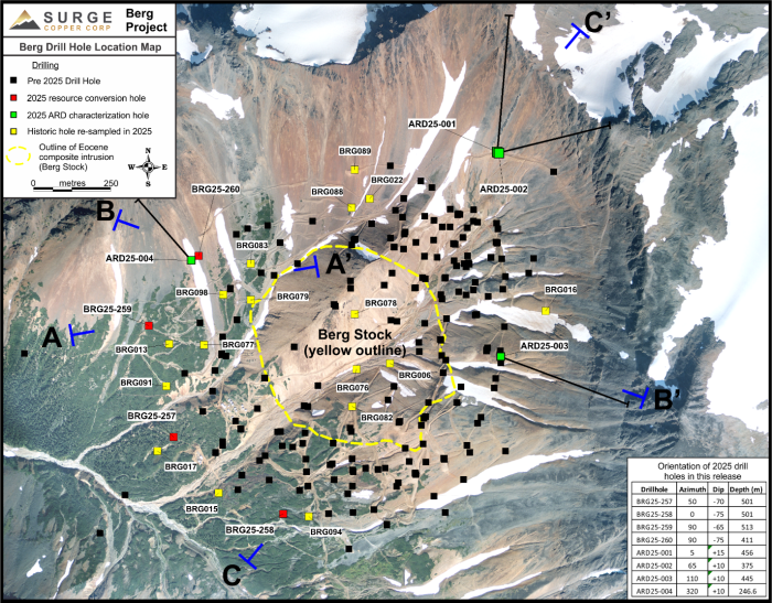 January 8, 2026 – Vancouver, British Columbia – Surge Copper Corp. (TSXV: SURG) (OTCQB: SRGXF) (Frankfurt: G6D2) (“Surge” or the “Company”) is pleased to report results from its 2025 multidisciplinary drilling and field program at the 100%-owned Berg Project in central British Columbia. The program was designed to advance Berg toward completion of a Pre-Feasibility Study (“PFS”) planned for H1-2026 (see November 19, 2025 press release), and was successfully executed with a focus on resource category conversion, validation of historic drilling through modern QA/QC procedures, acid rock drainage characterization, and geotechnical investigations for planned mine infrastructure.