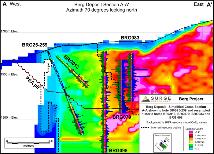 Figure 4. Cross section A – A’ showing drill hole BRG25-259 and historic holes BRG013, BRG083 and BRG098 which were resampled in 2025. See Figure 3 for cross section location.