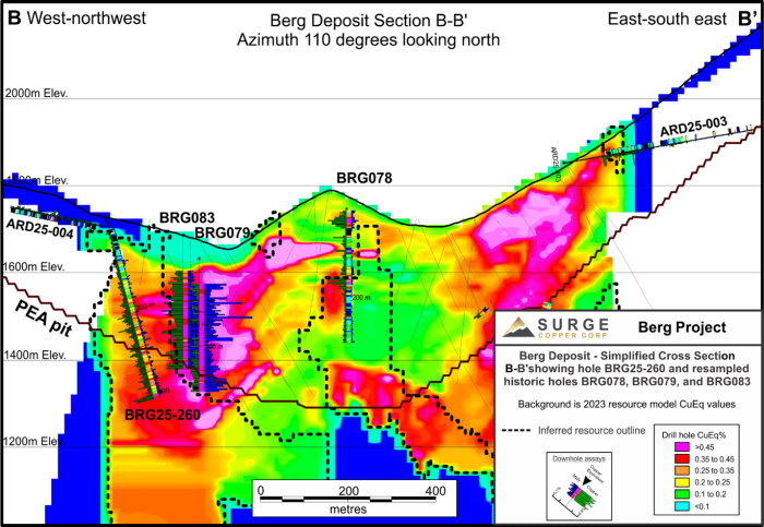 Figure 5. Cross section B – B’ showing drill holes BRG25-260, ARD25-003 and 004, and historic holes BRG078, BRG079 and BRG083 which were resampled in 2025. See Figure 3 for cross section location.