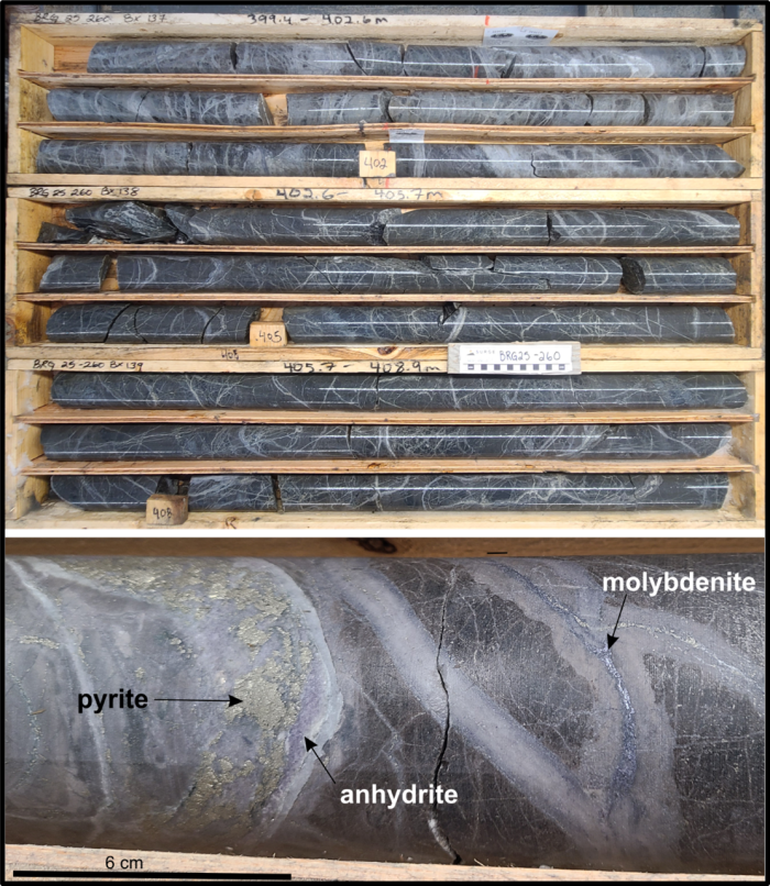 Figure 6. Photos from BRG25-260. Top: strong quartz, anhydrite, sulfide veining within andesite volcanic rocks 399.4 to 408.9m. Bottom: mineralized zone at 306m, strong quartz-molybdenite and quartz-anhydrite-pyrite-chalcopyrite-molybdenite veining in biotite altered andesite.