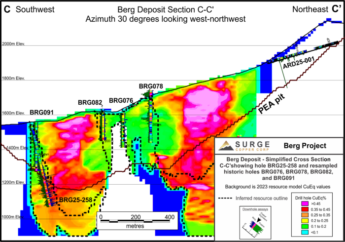 Hole BRG25-258, together with the resampling of historic hole BRG091, was designed to support conversion of a narrow zone of Inferred resources along the southern margin of the Berg deposit. In addition, resampling of historic holes BRG076, BRG078, and BRG082 targeted conversion of a substantial zone of Inferred resources within the lower-grade central portion of the Berg deposit.